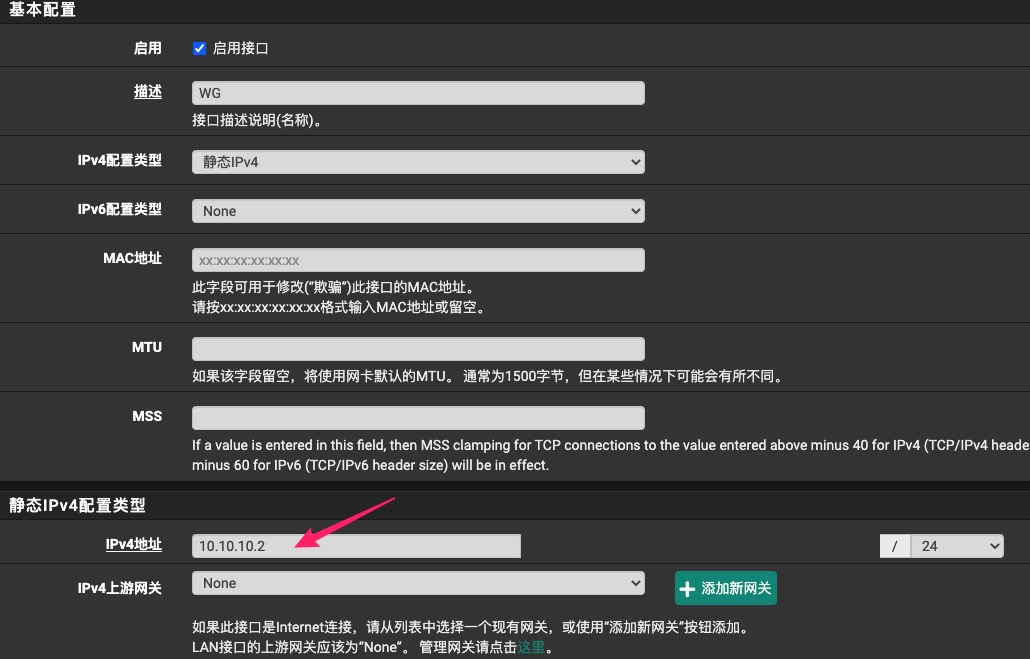 分配WG接口并填写IPv4地址:10.10.10.2/24。