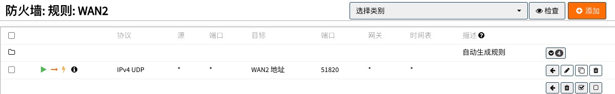第二条,在对应WAN接口上,添加允许WireGuard默认端口或自定义端口通行的防火墙规则,协议选UDP,如下图所示: