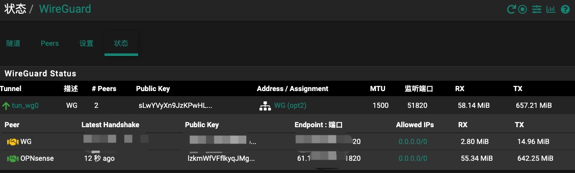 至此,两个防火墙上WireGuard VPN站点到站点的配置完成了。下图是两个防火墙连接后的详细信息。