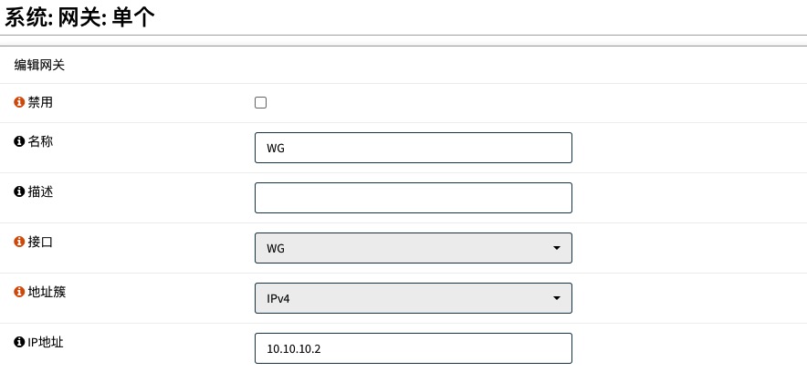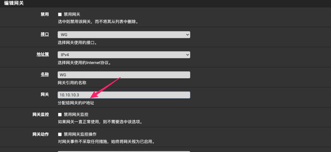 在防火墙B上,为WG接口添加远程网关。转到系统>网关>单个,在WG接口上添加新网关。注意网关地址填写防火墙A的WG接口地址:10.10.10.2。