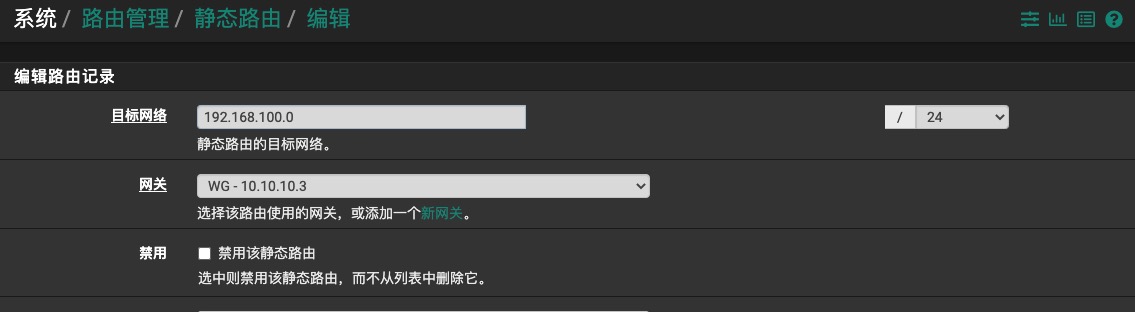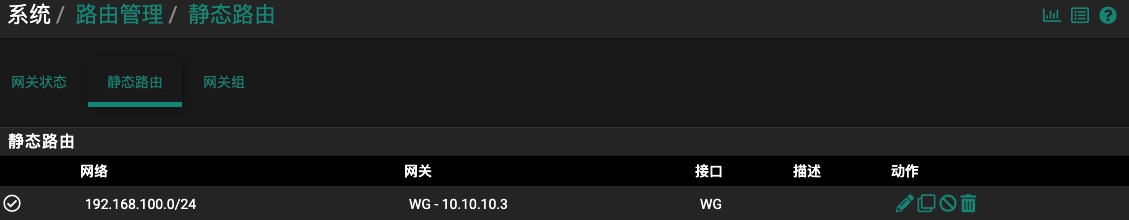 完成上面的步骤后,两端的WireGuard VPN隧道已经打通,在防火墙A上PING防火墙B的WG接口地址(10.10.10.3),是可以连通的,反之也可以。但这时候还不能访问对端的LAN子网,还需要添加WG网关,并填加基于WG接口的静态路由。