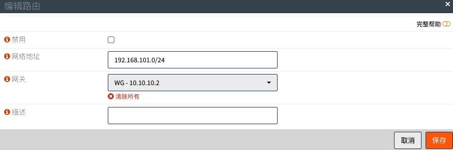 转到系统>路由>配置,添加一条静态路由。静态路由目标网络为防火墙A的LAN子网192.168.101.0/24,网关选上一步建立的WG网关。如下图所示: