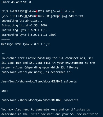 使用Winscp将下载的两个扩展名为txz的文件上传到pfSense的tmp目录,然后进入防火墙的shell环境,使用pkg add xxx.txz命令进行安装。如下图所示。