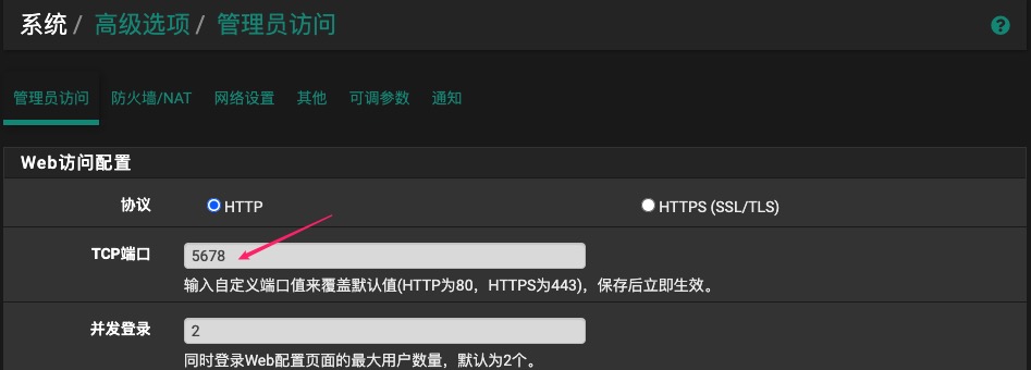 导航到防火墙的系统>高级设置>管理员访问菜单,将默认访问端口80改为自定义的端口,本示例修改为5678。修改后保存设置,用新设置的端口重新登录防火墙。