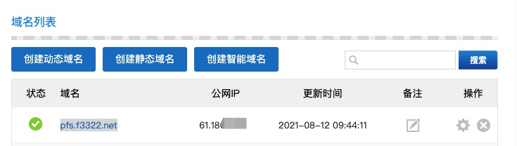 在3322的域名管理界面,可以看见防火墙的公网IP被正确解析。