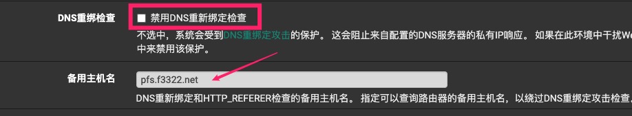 导航到防火墙的系统>高级设置>管理员访问,找到重绑定检查和备用主机名选项,这两个选项设置其中一个,就可以解除重绑定的安全检查。本示例中,在备用主机名处填入动态域名。