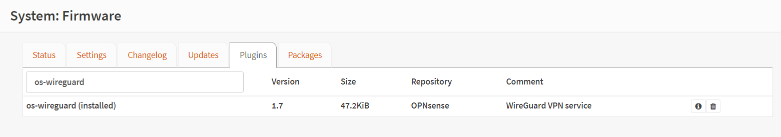 - 在os-wireguard插件的右侧,单击 图标进行安装。