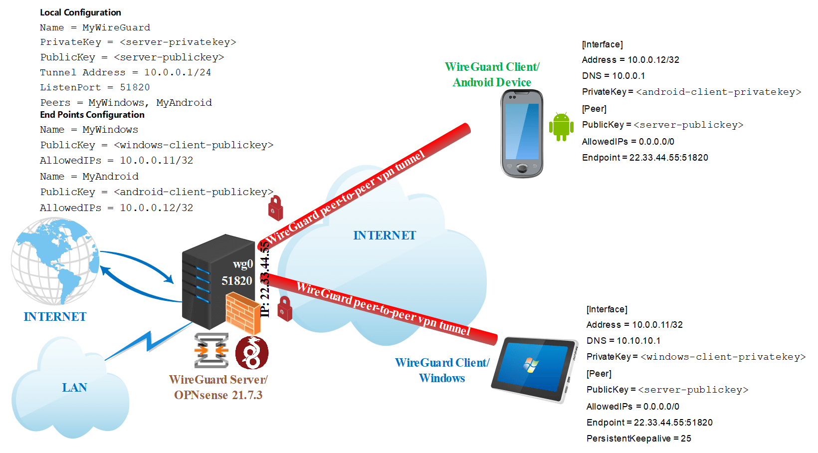 本教程介绍在OPNsense上安装WireGuard 服务器,配置一个或多个客户端来进行远程连接。使用的软件为OPNsense 21.7.3,客户端为运行Windows的计算机和Android移动设备。客户端的流量将通过 Ubuntu 20.04 服务器进行路由。
