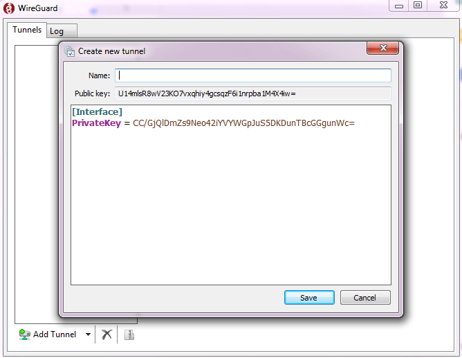 为隧道输入一个仅包含字母数字字符(无空格或标点符号)的名称,例如MyWireGuard,然后编辑配置如下: