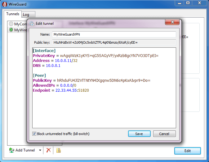 在编辑隧道窗口中,有一个Block untunneled traffic选项。当 AllowedIPs 设置为0.0.0.0/0时,可以启用此选项。启用该选项,WireGuard 客户端会添加 Windows 防火墙规则来阻止所有不进出隧道接口的流量。这样它可以防止在VPN之外意外发送IP数据包。