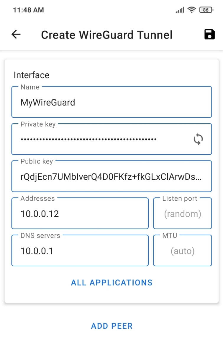 - Allowed IPs填入上面Android WireGuard 客户端配置中的地址字段,在本例中为10.0.0.12/32