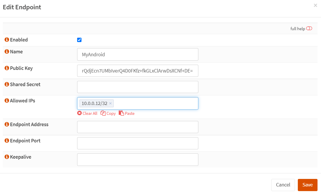 - PublicKey : android客户端的公钥。然后必须将公钥复制到OPNsense上相关客户端对等点的的端点配置中。