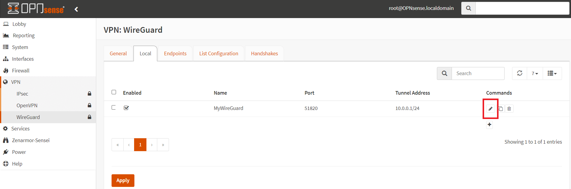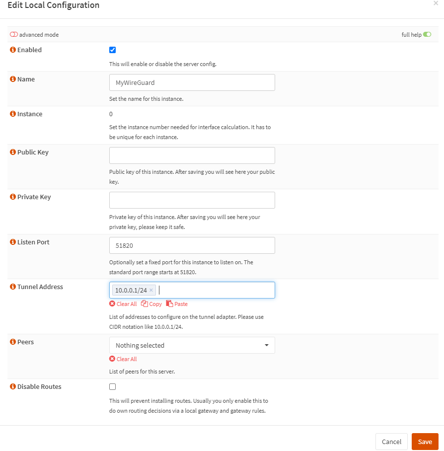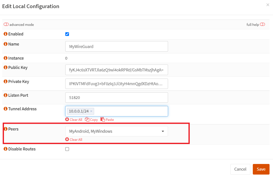 图 7. 在 OPNsense 上编辑本地 WireGuard VPN 服务器配置