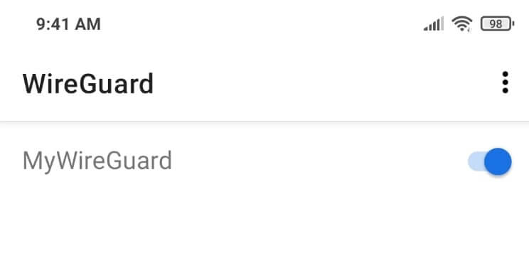 - 激活 WireGuard Android 客户端:Android 设备连接 VPN 服务器,启动 WireGuard 应用程序,单击MyWireGuard右侧的切换按钮打开隧道。