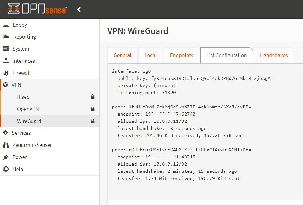- 在OPNsense上查看VPN连接:导航到VPN-> WireGuard->List Configuration选项卡。可以看到有关已连接 VPN 客户端的信息。显示以下详细信息: