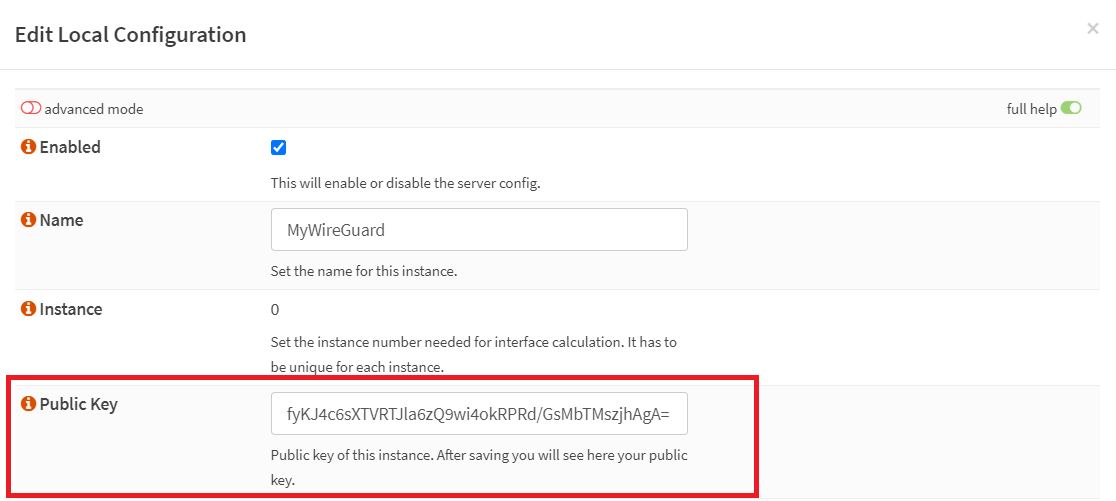 - PublicKey:Windows 客户端的公钥。然后必须将公钥复制到OPNsense上相关客户端对等点的的端点配置中。