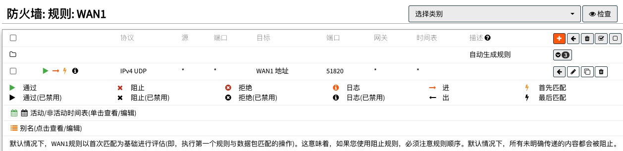 要允许从公共网络访问WireGuard/OpenVPN VPN 服务器,需要在WAN接口上放行WireGuard所使用的端口,在本例中为51820。如下图所示(示例为多Wan,允许从Wan1连接):