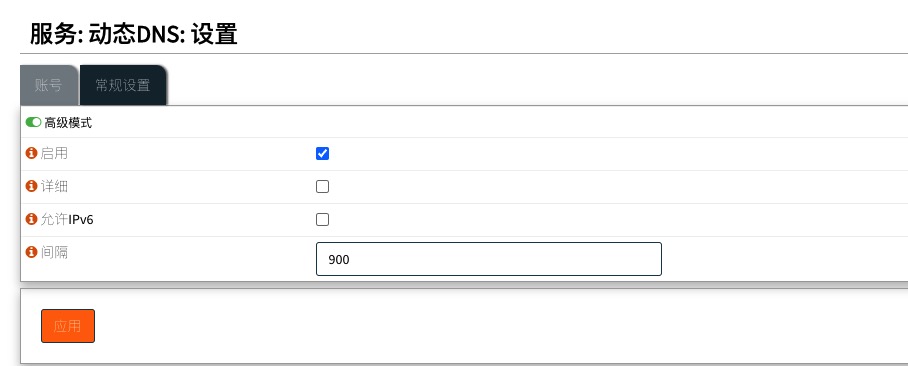 在“服务 > 动态 DNS > 设置”页面和“常规设置”选项卡上,可以选中“详细”选项来启用详细日志记录,将会在“服务 > 动态 DNS > 日志文件”页面显示更多详细信息。如果希望更新 IPv6地址,请选中“允许 IPv6”选项。
