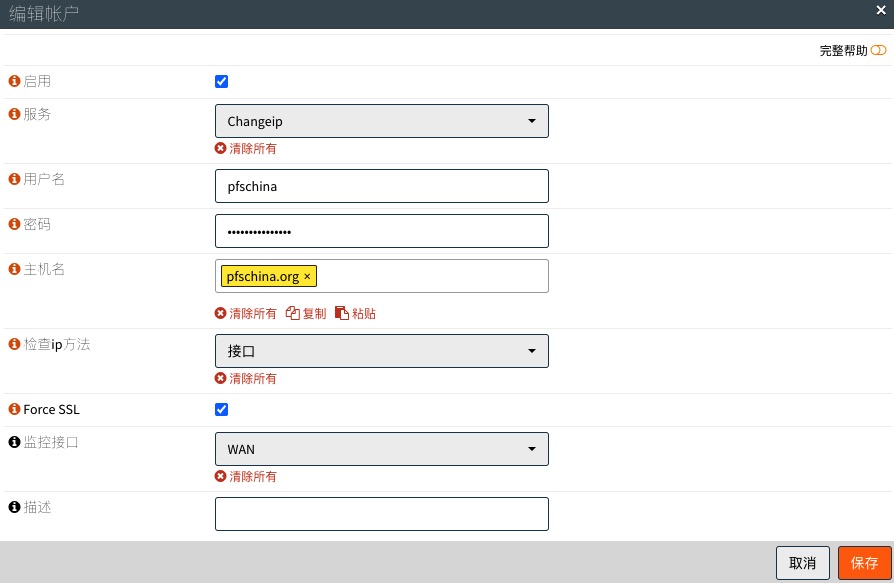 如果防火墙直接连接到 Internet,则“检查ip方法”设置为“接口”。”监控的接口”选WAN,如果有多个WAN接口,请选中正确的接口。输入改动态DNS记录的描述说明。