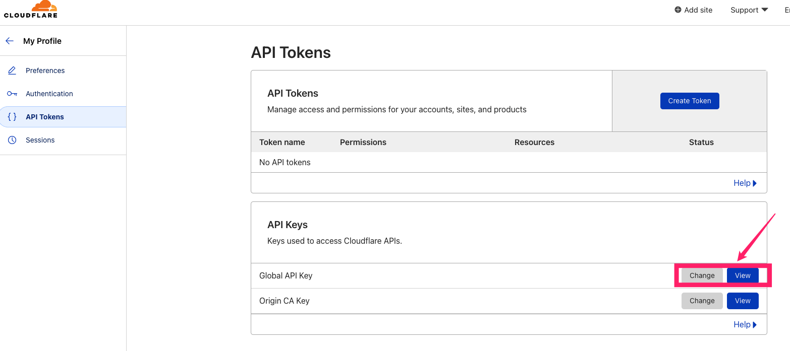 导航到My Profile > API Tokens,点击全局 API 密钥旁边的查看按钮: