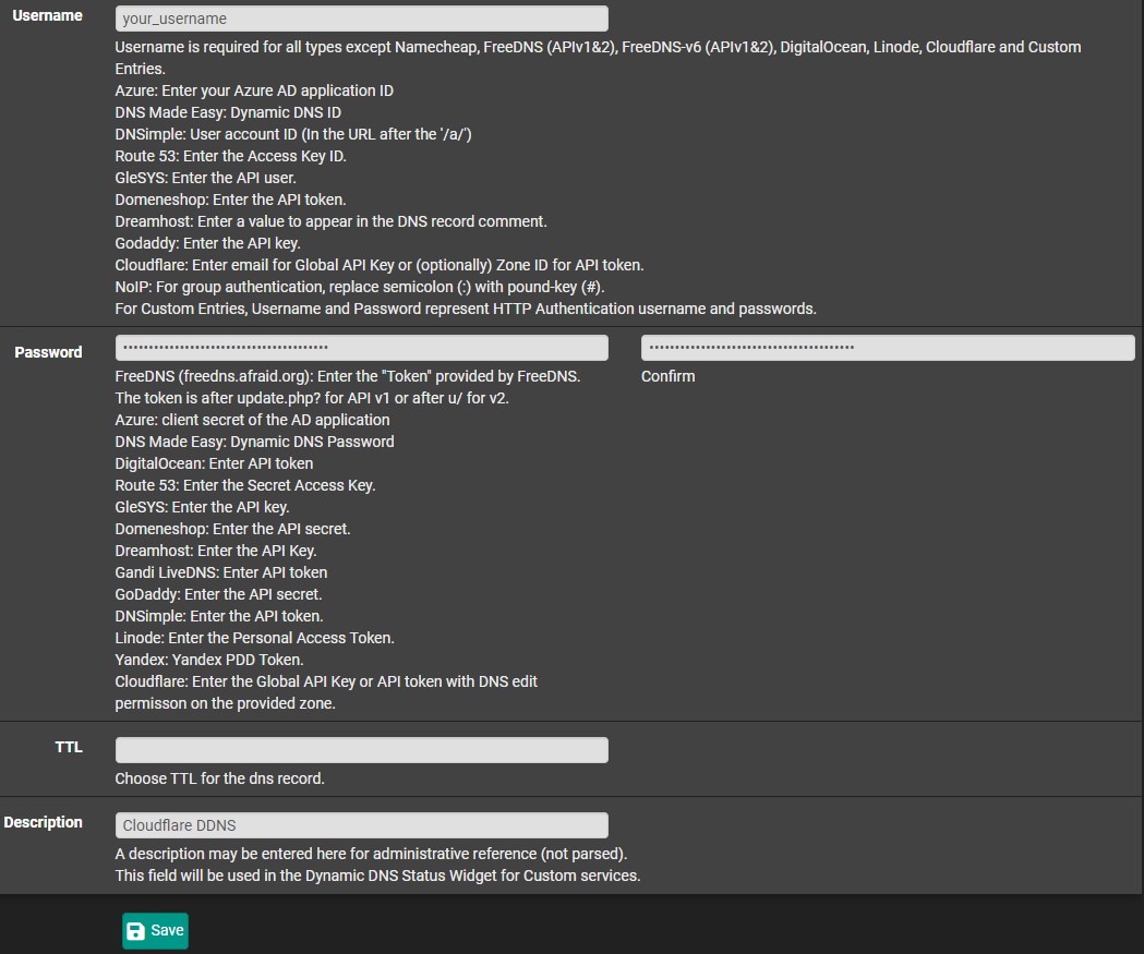 pfSense集成了动态DNS管理功能,下面介绍设置Cloudflare动态DNS的过程。