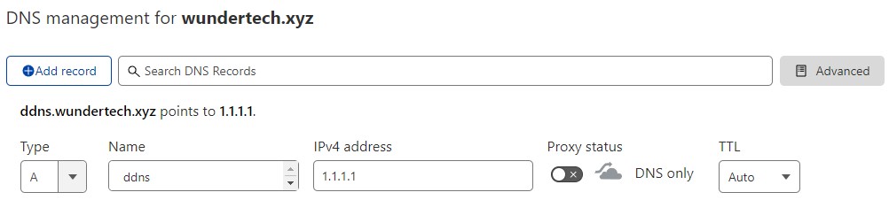 点击右侧的添加记录,类型为A。名称部分,可以只输入子域部分,这是域名之前的扩展名(本例为ddns)。或者使用@符号直接指向你的域名(没有子域)。在IPv4字段中,输入1.1.1.1(Cloudflare的DNS服务器,稍后会自动更新),将代理状态更改为仅DNS,然后点击保存。