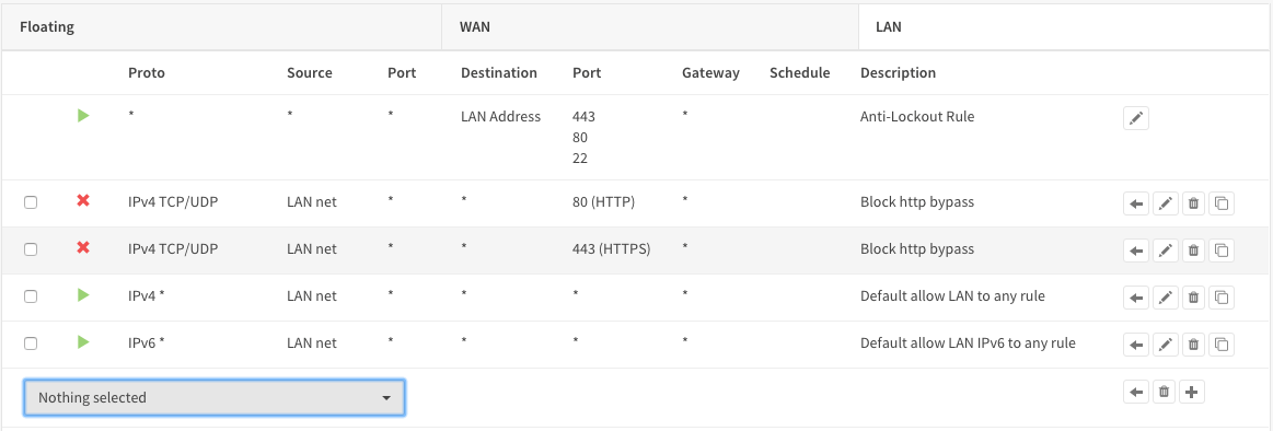要确保没有人可以绕过代理,您需要添加防火墙规则。转到防火墙 – >规则,并将以下内容添加到LAN接口上的列表规则顶部(如果LAN是您的客户端和代理所在的位置)。
