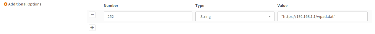 这将定义DHCP中配置的任意域名的主机记录,作为防火墙主机的CNAME。它还将覆盖TXT记录解析为PAC文件的URL。