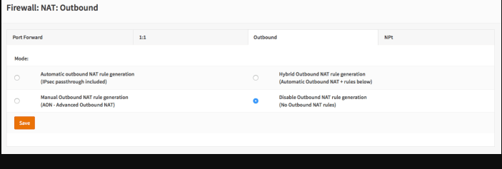 要禁用出站NAT,请转到 防火墙 – > NAT – > 出站:禁用出站NAT规则生成