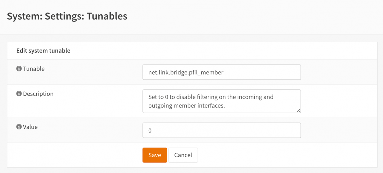 导航到系统 – > 设置 – > 参数,将net.link.bridge.pfil_bridge从默认值更改为1来启用桥过滤。