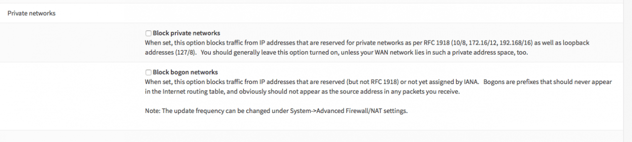 对于WAN接口,我们需要禁用阻止专用网络和bogon网络。