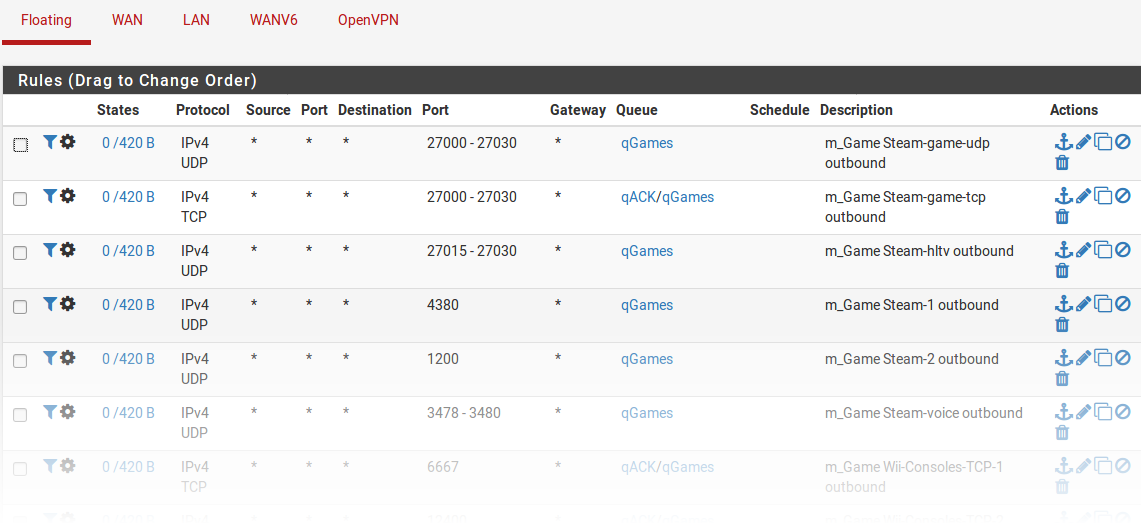 如果VPN内的所有流量必须由防火墙确定优先级,那么仅考虑直接在WAN上的VPN流量本身就足够了,而不是单独尝试在VPN上排队流量。在这些情况下,请在WAN上使用浮动规则来匹配VPN流量本身。确切的流量类型取决于VPN的类型。 WAN上的IPsec和PPTP流量都可以通过整形器向导进行优先级排序,这些规则可用作匹配其他协议的示例。