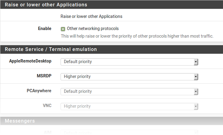 使用VPN进行流量管理器是一个棘手的话题,因为VPN流量被视为与流量相分离,但也是流量的一部分。如果WAN为10 Mbit / s,那么VPN也可以使用10 Mbit / s,但实际上并没有考虑20 Mbit / s的带宽,只有10 Mbit / s。因此,比带宽更重视优先级的流量管理方法更可靠,如PRIQ或某些情况下的CBQ。