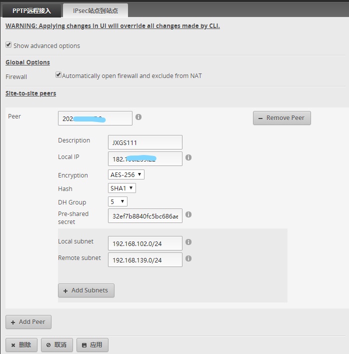 3、按下图进行设置,Peer填远程主机的公网IP或主机名,Local IP填本地公网IP,如果是拨号上网的也可以填0.0.0.0。其他字段根据自身网络情况进行设置。设置完成后点应用!