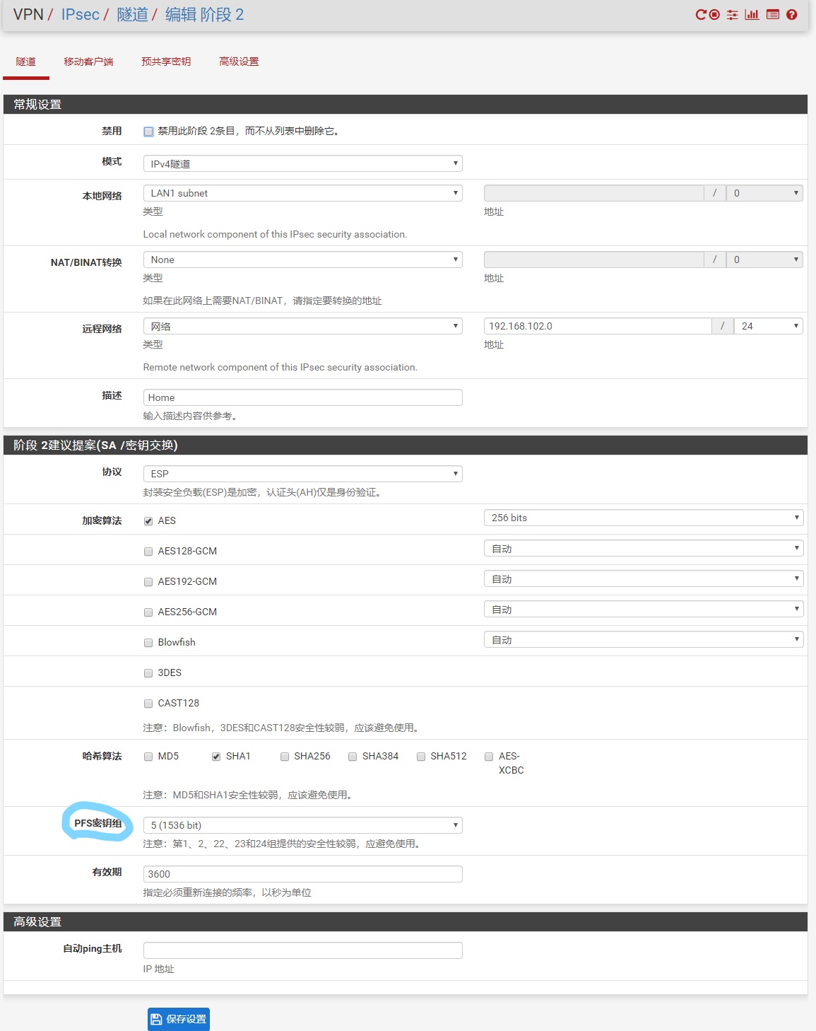 在阶段2的设置中,要注意PFS密钥组的设置,与阶段1的DH组相同。设置完成后,点应用更改。