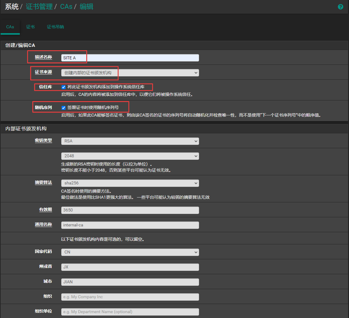 分别在站点A和站点B上创建证书颁发机构(CA)和证书。为了便于区分,站点A采用的深色主题,站点B采用的浅色主题。