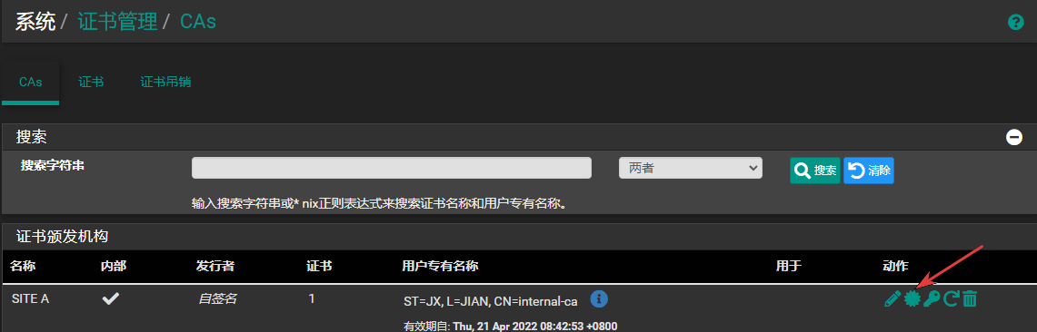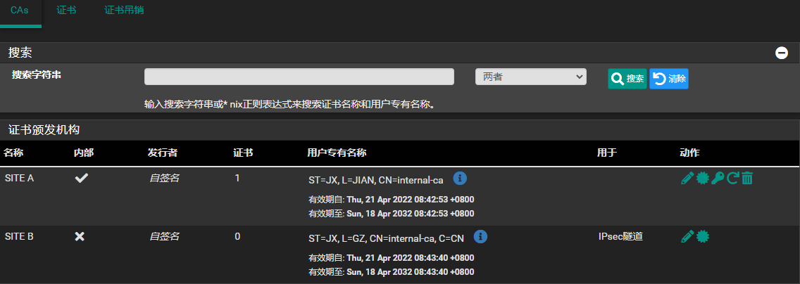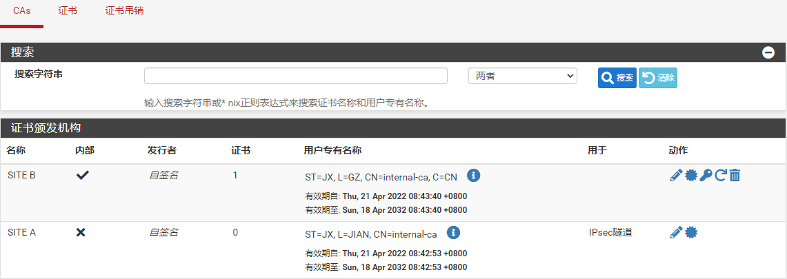 保存后,CAs选项卡下,将会出现两个站点的CA信息。下图分别是站点A和站点B的CA列表: