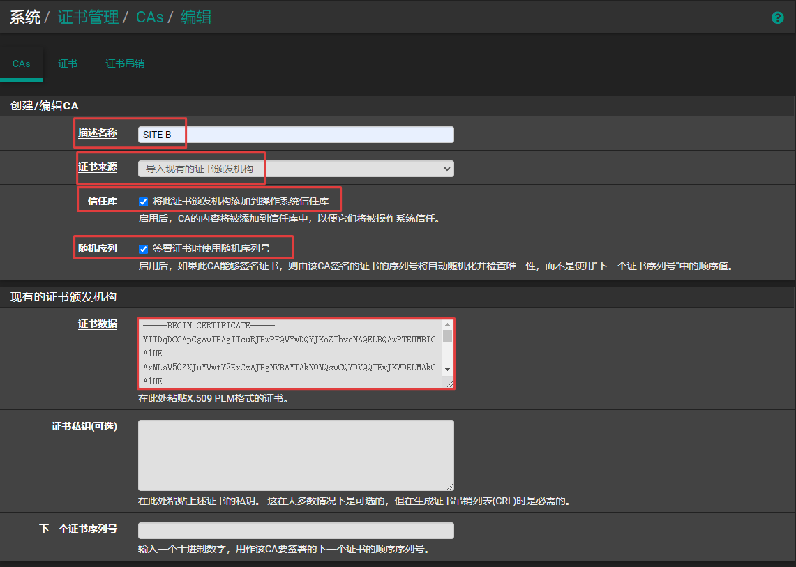 2、分别导入对方的CA。导航到系统 > 证书管理,CAs选项卡,单击下方的添加按钮,在证书来源选项,选择导入现有证书颁发机构。用文本程序打开对方的证书文件,将里面的内容复制到证书数据栏,并单击保存。