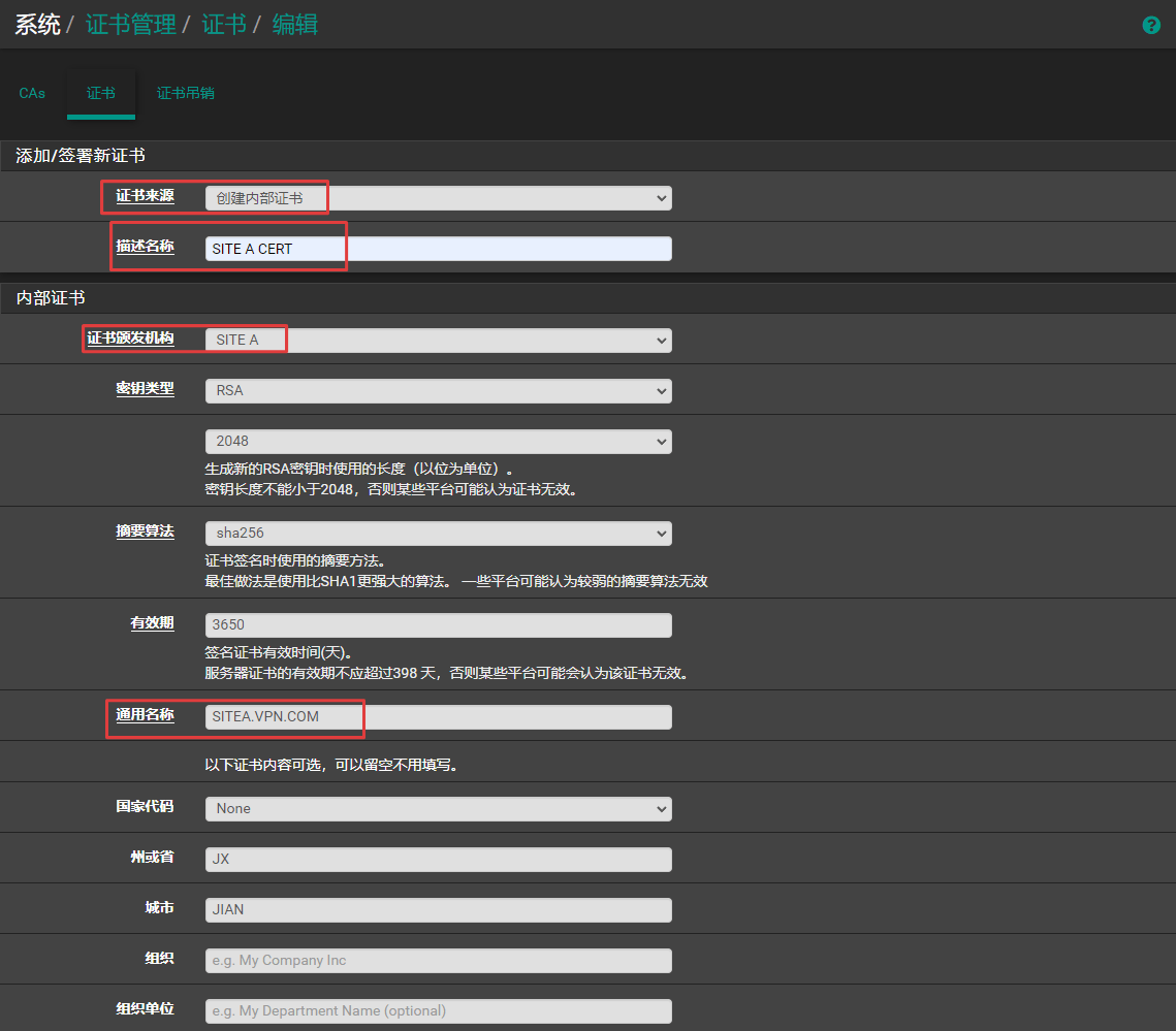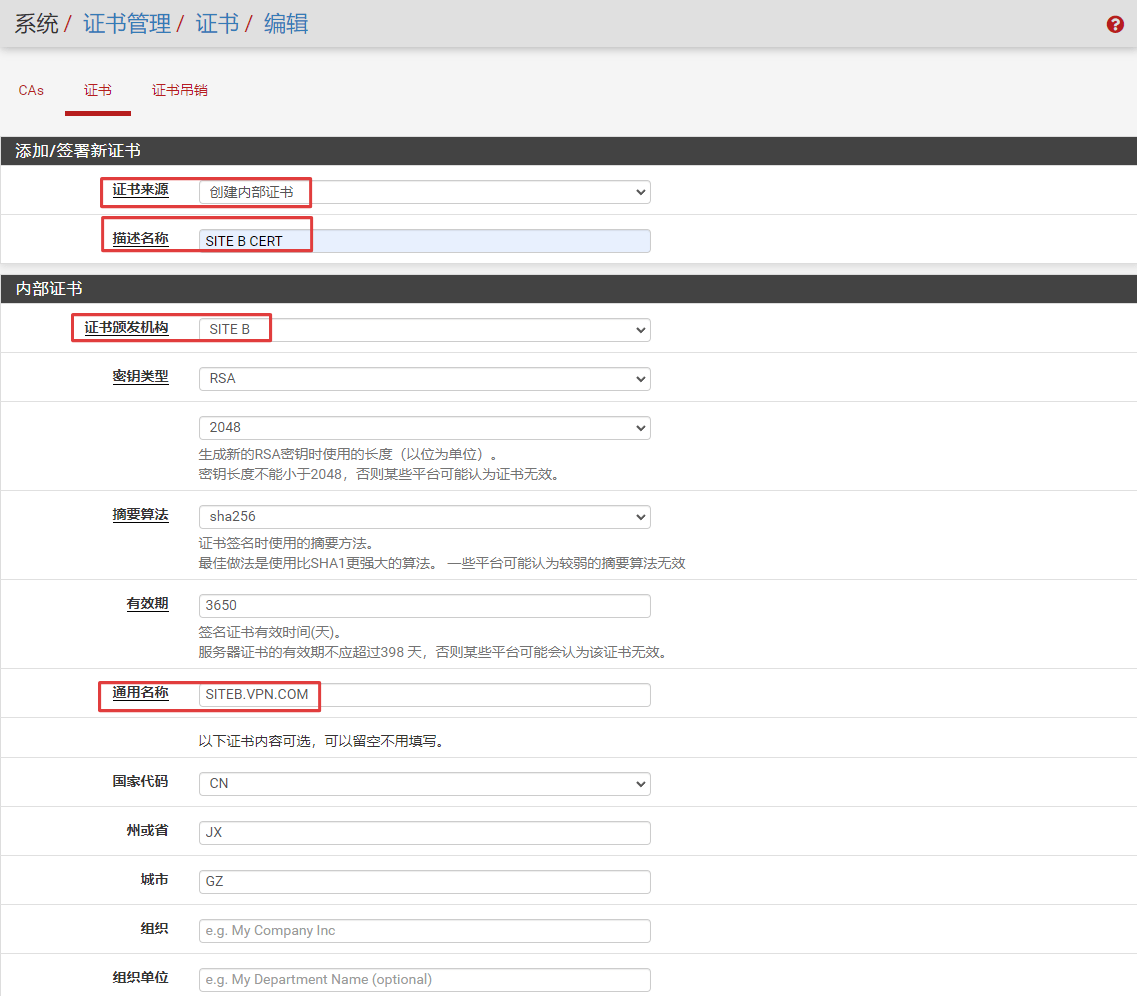 使用证书认证相比共享密钥认证建立IPsec VPN隧道多了一个创建CA和证书的过程,提案(认证)选项的设置不同,除此以外,两者的其他设置完全相同,这里就不再赘述了。