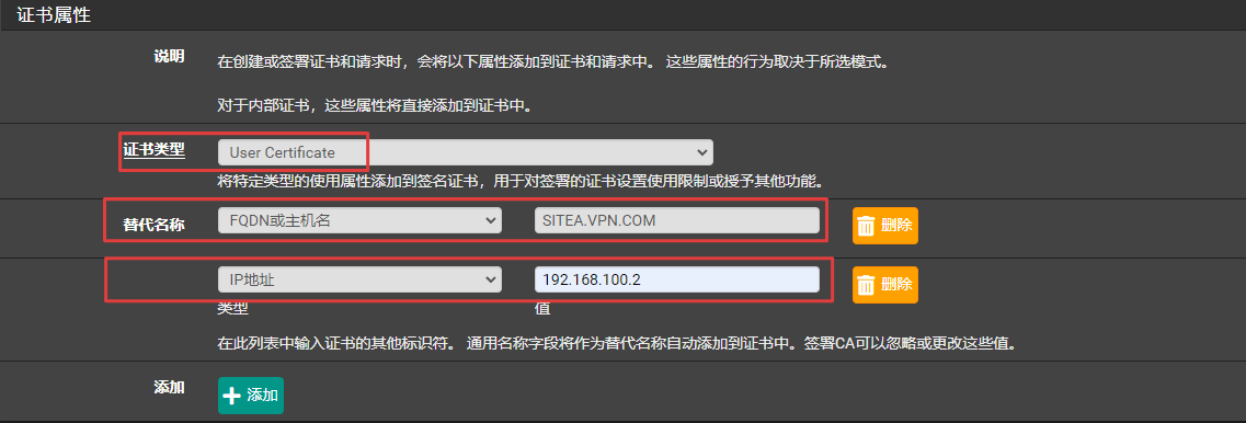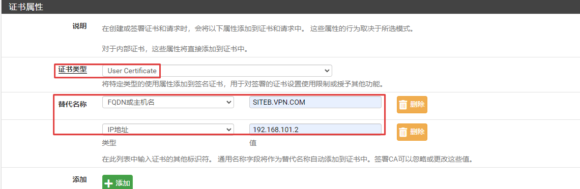 - 证书属性部分,证书类型选用户证书,替代名称分别输入主机名和IP地址(LAN地址),这部分信息将在阶段1中用于认证使用。