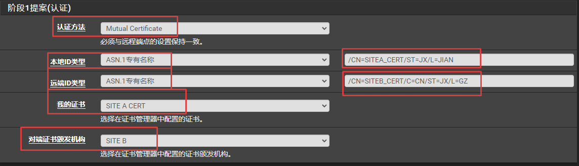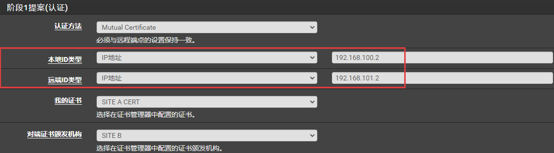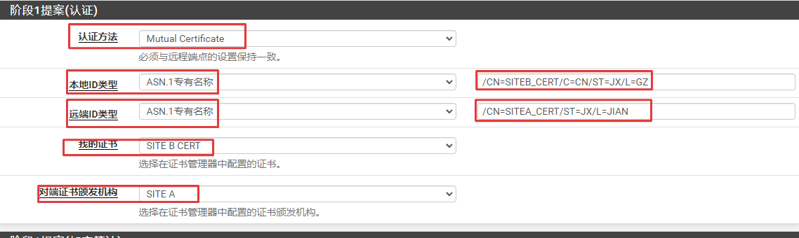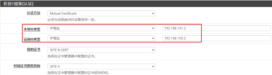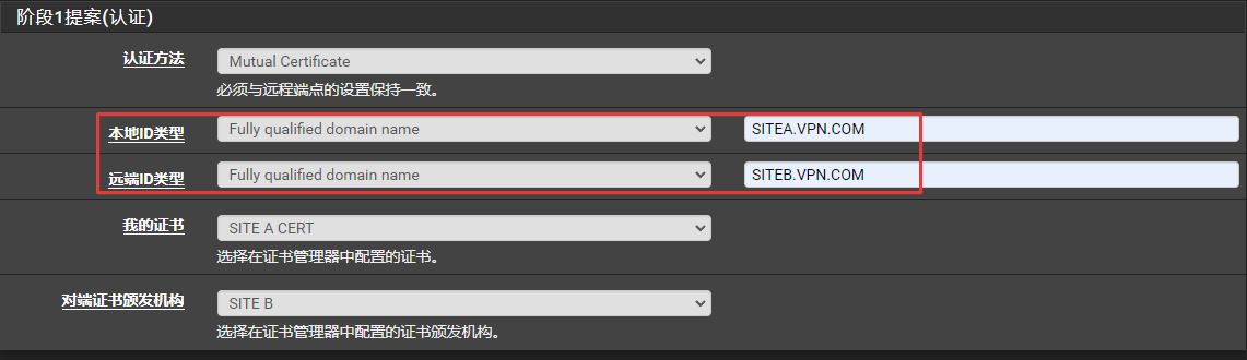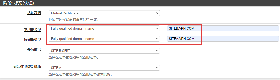 修改站点A和站点B的阶段1设置,将提案(认证)改为Mutual certificate(相互证书),并调整相应的选项设置。根据采用认证ID类型的不同,有三种相互认证方式:
