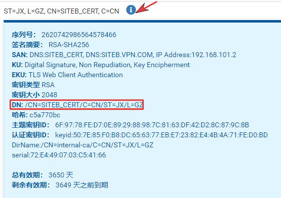 1、使用ASN.1专有名称。使用证书中的ASN.1专有名称来相互认证。ASN.1专有名称可以在证书列表单击证书详细信息图标查看,如下图所示DN后面的内容: