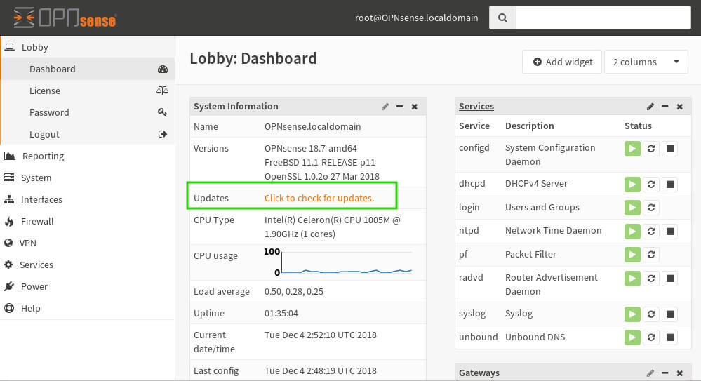 回到主仪表板,可以继续安装/配置需要的OpnSense插件或功能!一般建议检查和升级系统(如果有升级)。只需单击主仪表板上的“Click to Check for Updates(单击以检查更新) ”按钮。