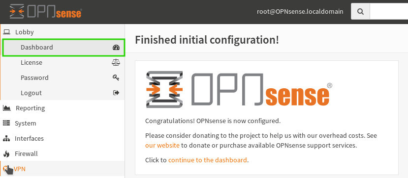 完成所有操作后,OpnSense将显示欢迎用户界面。要返回主仪表板,单击网络浏览器窗口左上角的“Dashboard(仪表板)”。