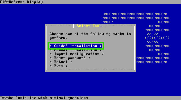 下一步会有一些安装选项。如果用户希望进行高级分区或从另一个OpnSense导入配置,则可以在此步骤中完成。本教程为全新安装,选择“ Guided Installation ” (引导式安装)选项。