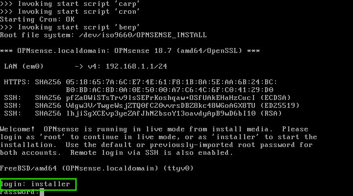 继续安装,只需按回车键。这会将OpnSense引导到 Live mode(在线模式),在这种模式下,不能保存设置,如果是安装到本地,需要使用不同的用户名和密码。当系统引导至登录提示时,请使用用户名“installer”和密码“opnsense”进行登录,就进入了本地安装模式。