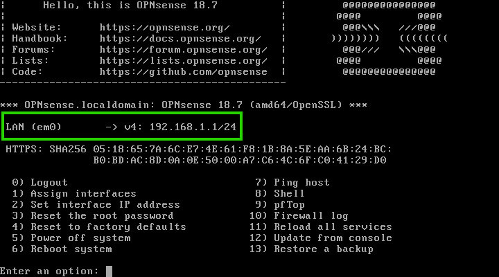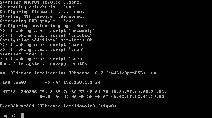 使用安装期间配置的root用户和密码登录后,可以看到,OpnSense仅使用了此计算机上的一个网络接口卡(NIC)。在下图中,显示为LAN(em0)。