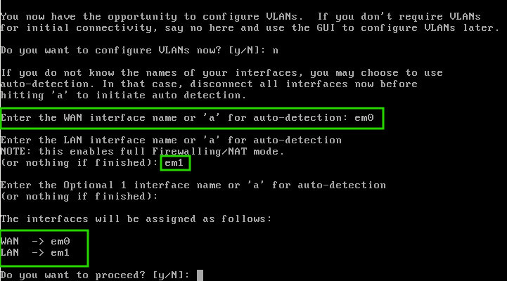 输入‘N’不配置任何VLAN。在本教程种,WAN接口为“ em0”,LAN接口为“ em1”。