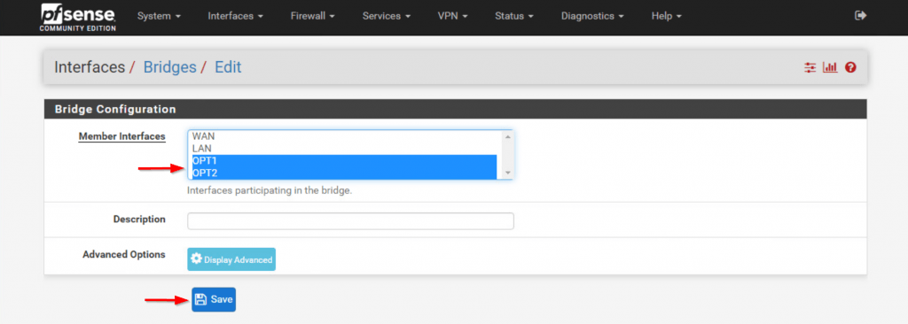 使用Ctrl + 单击选择OPT1和OPT2。不要选择LAN接口。单击保存。