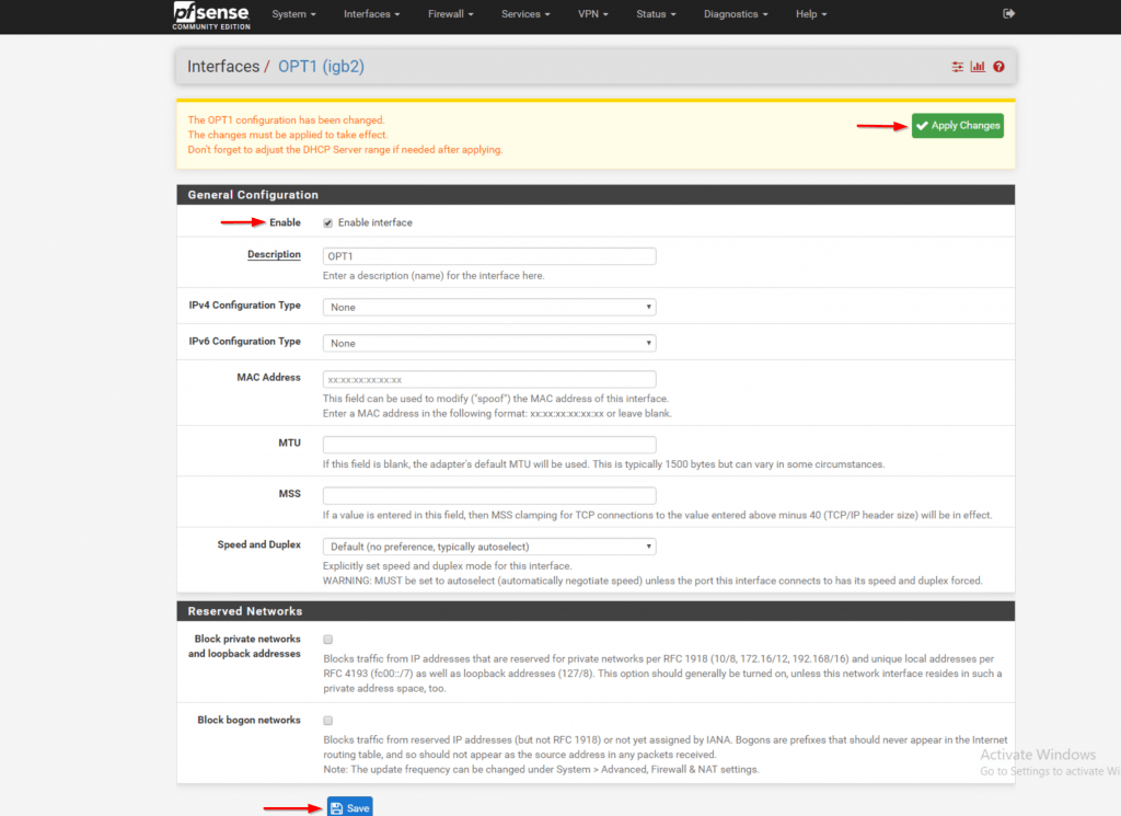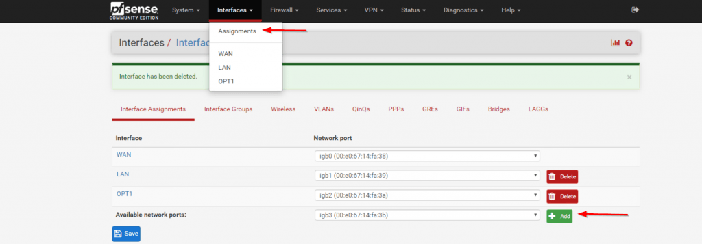 导航到接口管理菜单,添加可选接口(OPT1,OPT2),单击保存。